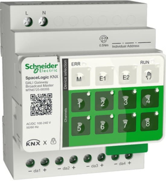 The SpaceLogic KNX DALI Gateway Broadcast Master 4 channel/32 is a single-master application control-ler for controlling electronic ballasts with up to four DALI interfaces via the KNX installation bus. It supports ballasts according to EN 62386-102 ed1 (DALI1) as well as devices according to EN 62386-102 ed2 (DALI2).