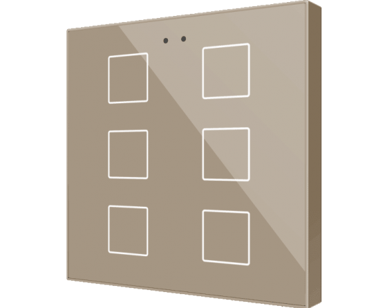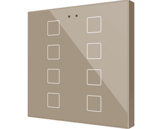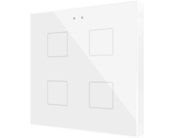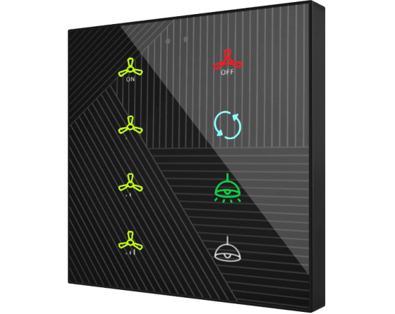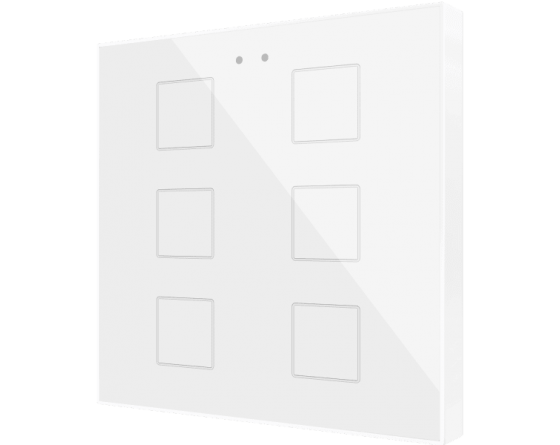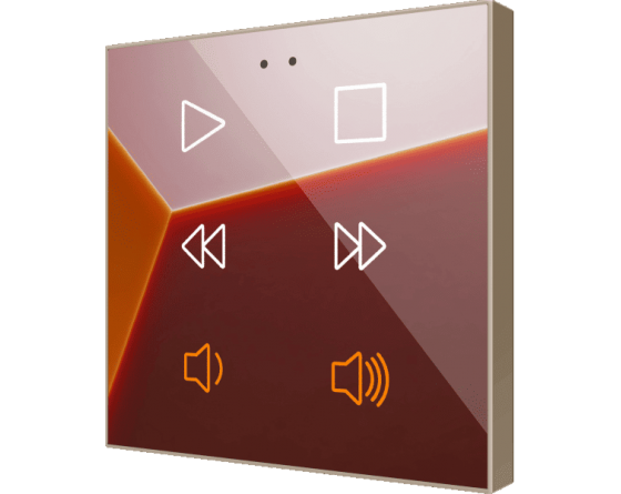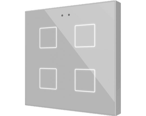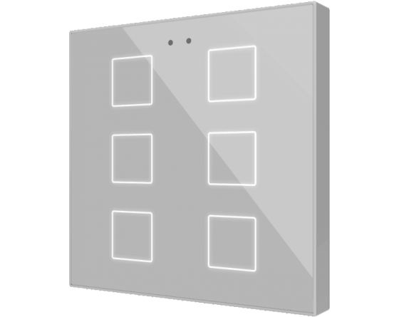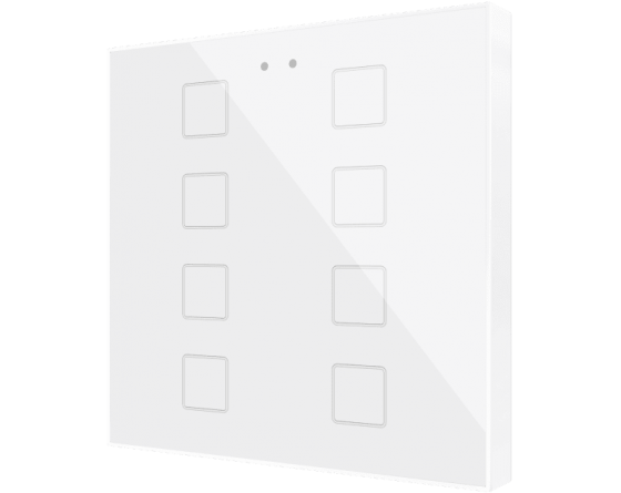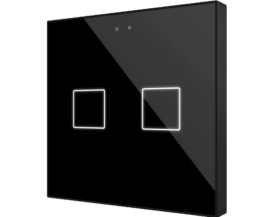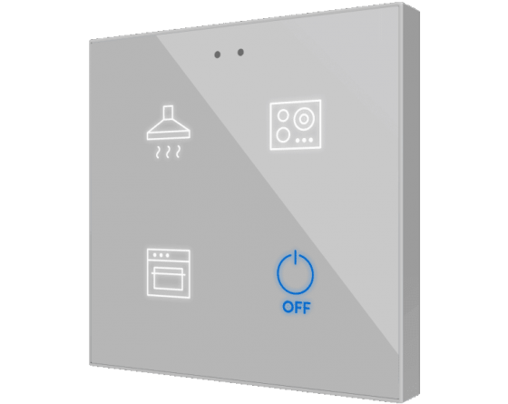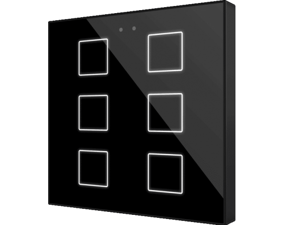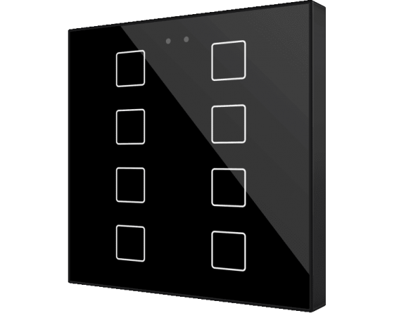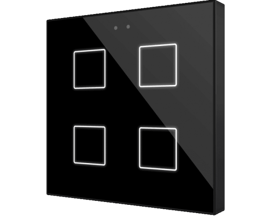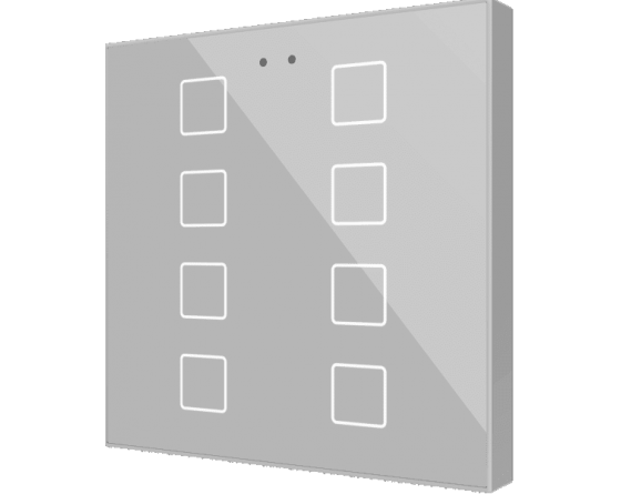 Customisable RGB backlit capacitive touch switches in the Flat family with proximity sensor and flat design (9 mm). Create unique designs including images, icons, texts or logos printed on tempered glass. 1, 2, 4, 6 or 8-button versions available all with backlit icons that adapt according to the proximity sensor. Flat RGB incorporates an internal temperature probe and thermostat as well as 2 analog-digital inputs to be configured as binary inputs, sensors, push buttons, temperature probes or motion detectors. It is compatible with KNX Secure.