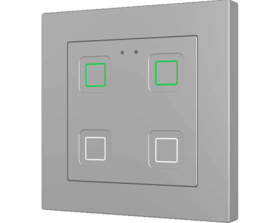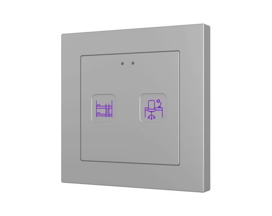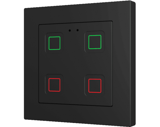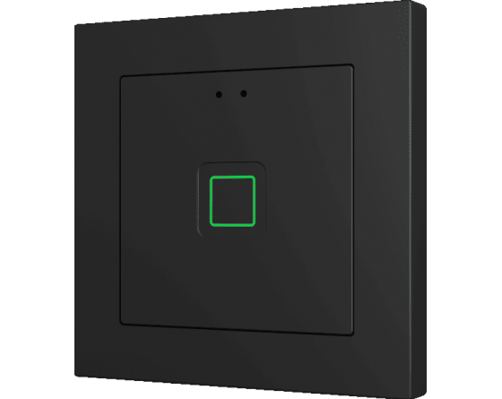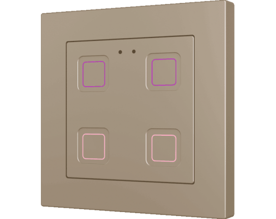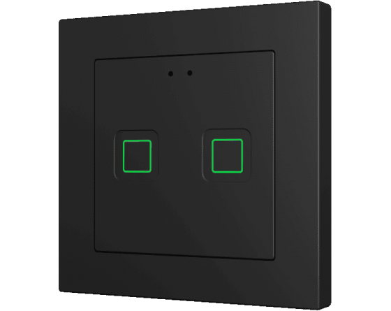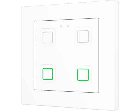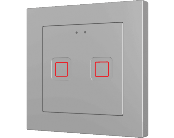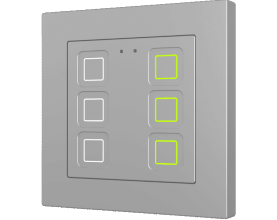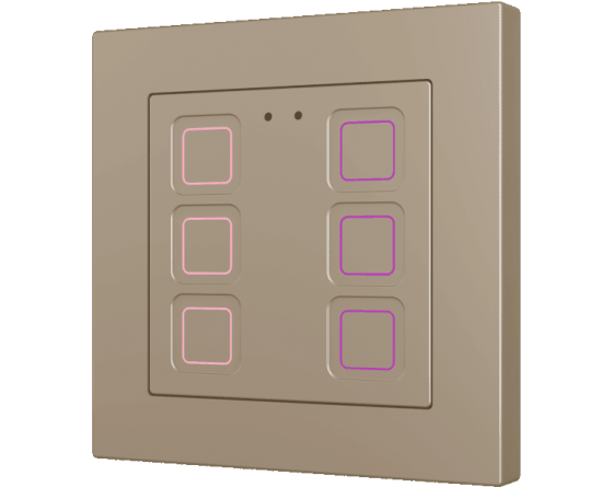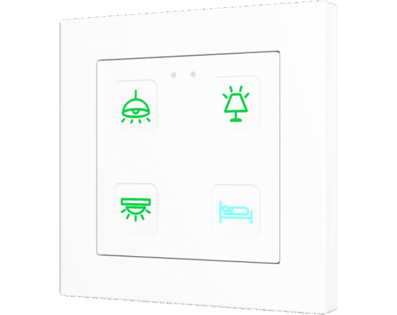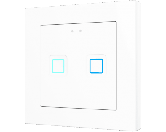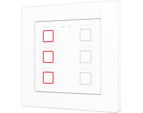 Family of flush fitting polycarbonate capacitive touch switches with customisable RGB icons, to be combined with 55 x 55 mm frames and Zennio ZS55 switches and sockets. 1, 2, 4 or 6-button versions all available with RGB backlit icons that adapt according to proximity sensor. Tecla RGB 55 incorporates an internal temperature probe and thermostat as well as 2 analog-digital inputs to be configured as binary inputs, sensors, push buttons, temperature probes or motion detectors. Installation in standard back box with 55 x 55 1 to 4-gang frames.