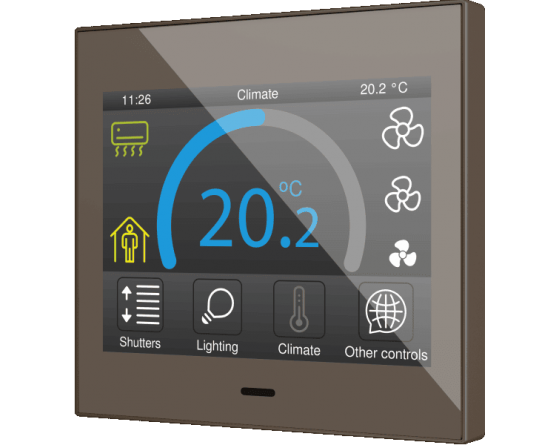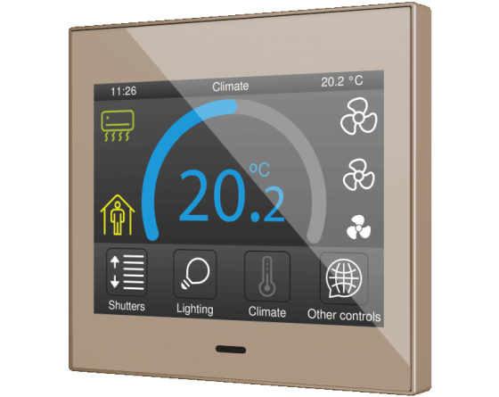 Capacitive touch panel with a backlit 3.5” display, proximity sensor, internal temperature probe, internal humidity sensor and thermostats for two independent areas. It is able to contain up to 56 controls/indicators, distributed in up to 7 pages with a navigation menu. A screensaver with date, time and/or temperature is set when the touch panel is not in use and the menu is shown automatically when the user approaches thanks to the proximity sensor. Its brightness is regulated by the ambient luminosity sensor included. In addition, it incorporates 4 analog-digital inputs that may be configured as binary inputs for sensors and potential-free push buttons, as temperature probe inputs or as motion sensor inputs. It is compatible with KNX Secure. Available in White, Anthracite and Silver. Accessories: temperature probe, motion sensor.