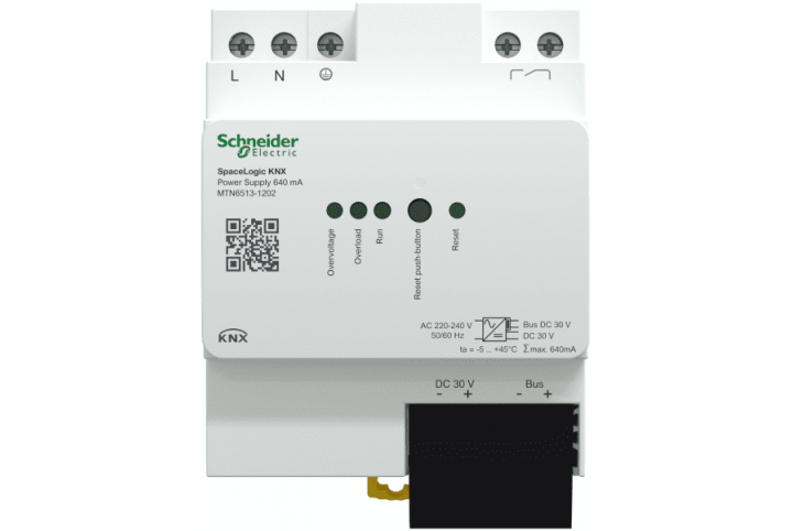 SpaceLogic KNX Power Supply 640 mA The SpaceLogic KNX power supply generates the bus voltage for the KNX line The power supply has two outputs – one KNX output with integrated choke and one DC 30 V output for additional devices The power supply has a floating signalling contact for operation and diagnostic message